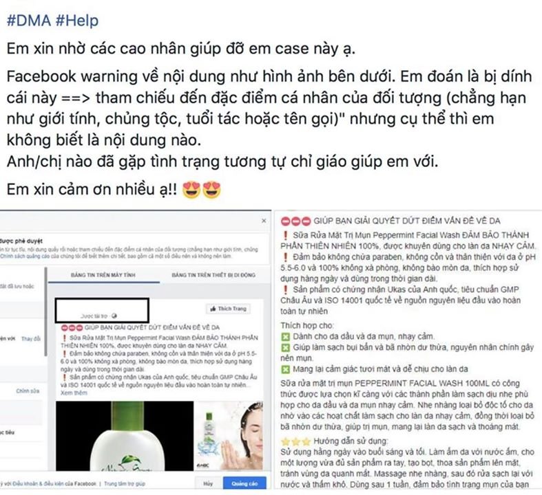 Đây có thể nói là lỗi phổ biến và kinh điển nhất đối với quảng cáo ngành Sức khoẻ-Làm đẹp. Quan điểm của FB như sau: khi bạn làm nội dung, không được ám chỉ người đang đọc bài quảng cáo có một đặc điểm nào đó. Ví dụ: